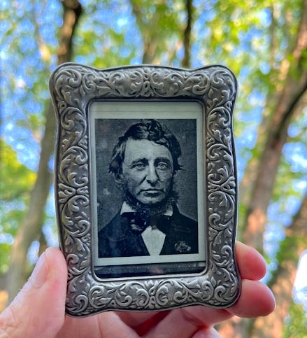 A few years later I came across this small photo of Thoreau and always had it as a reminder, pinned to the bulletin board above my various desks as I moved about in my career. A decade or so ago I spotted a perfect little frame and Thoreau’s image has been perched on various book cases ever since.